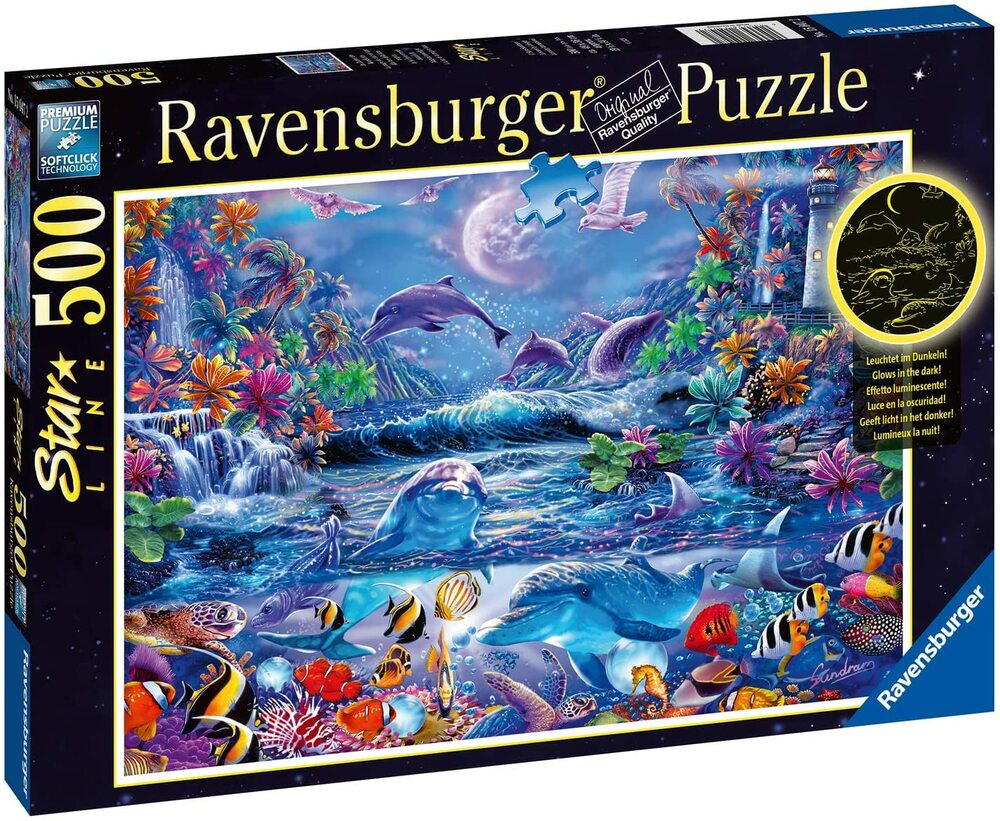 Sit back and enjoy the views of a moonlit cove with the Moonlight Magic 500 piece puzzle from Ravensburger. This puzzle features a picturesque seaside cove filled with colorful and lively marine life. In the distance you can see whales breeching, beautiful flora lining the cliff face, and a lighthouse standing tall. This well-made puzzle is sure to immerse you in the care free sea cove scenery. Become one with the ocean today with the Moonlight Magic puzzle!