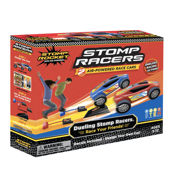 Challenge your friends to a race with this kid-powered Stomp Rocket® Dueling Stomp Racer air-powered race cars! Two kids can launch their cars at the same time to see who gets to the finish line first!