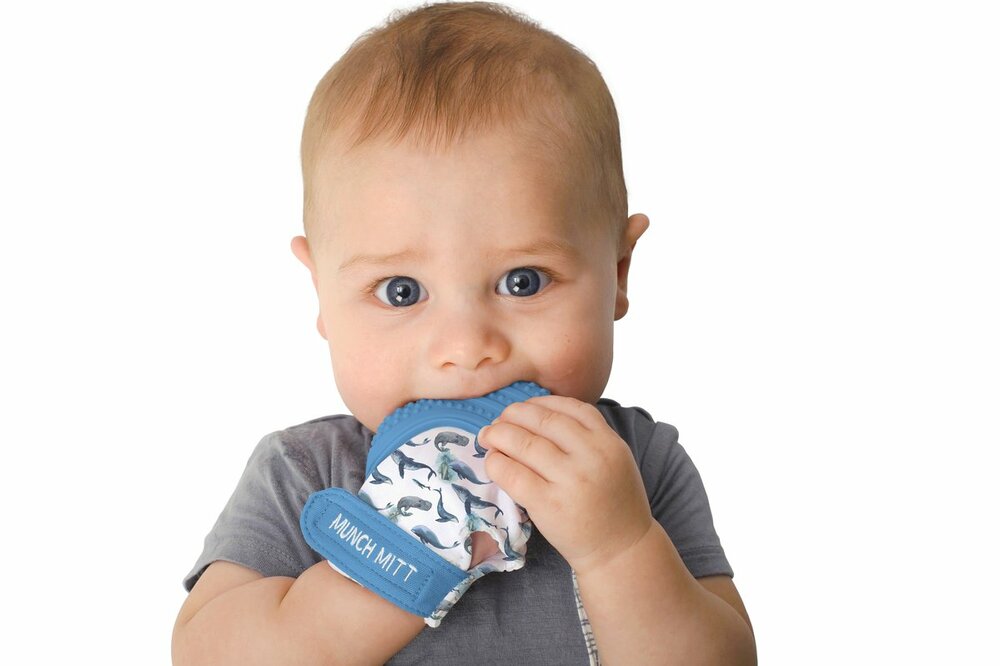 Munch Mitts are a hands free teether that eliminates the issue of fallen teether toys. They include adjustable straps to fit babies hands from 3-8 months all the way to 12 months. Munch Mitts also have a stimulating texture to help engage, sooth, and ease cutting gums. They are the perfect on-the-go aid for any new or experienced teether!