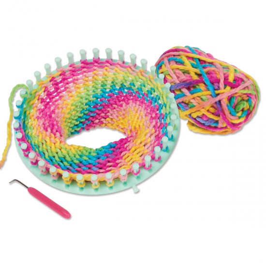 Unlike traditional knitting or crochet, this quick knit loom is so simple to use. No special skills required -simply wind the yarn around the tools provided. Flip the yarn loops and create quick and easy fashions. Includes 90 yards of yarn! A large circle loom and a two sided hand loom. Add your own designer touches with the tassel maker and decorative buttons included.