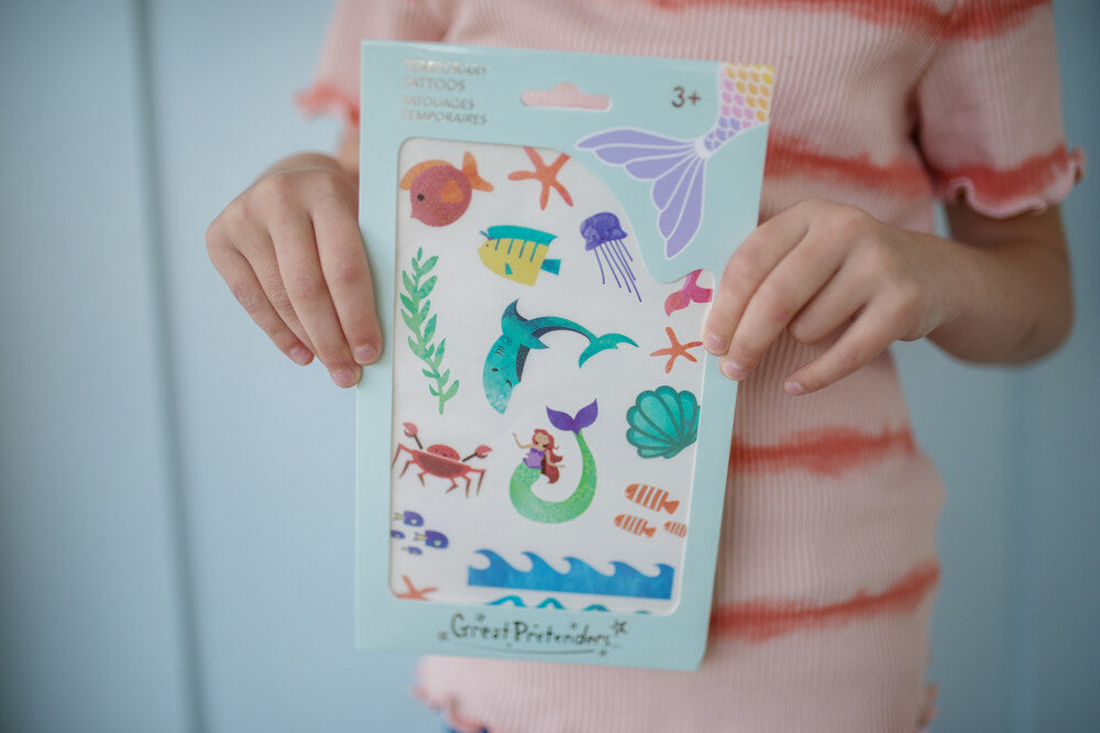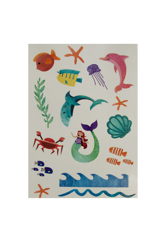 Dive into the magical mermaid sea and look extra fabulous while doing it! This set of temporary tattoos includes mermaids, dolphins, ocean waves and seashells made with a glitter finish to reflect beautifully on the skin!