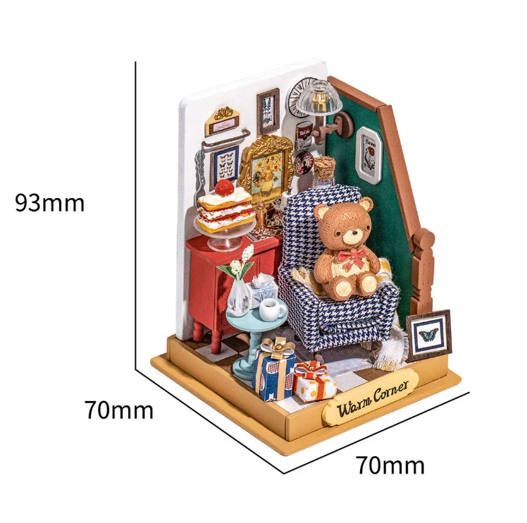 Build your own teeny holiday living room kit! This set comes with everything you need to make a miniature room model. All the miniature house kits come with painted pieces, so all your have to do is put it all together.