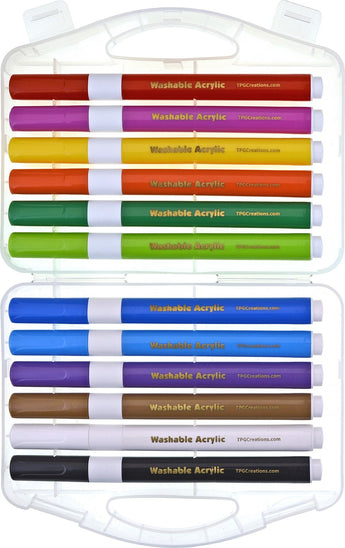 The first ever Washable and completely non-toxic Acrylic Paint Pens! For use on: Glassware, Wood, Canvas, Windows and Mirrors, and more. Washes off from most surfaces. No toxic chemicals or odors. Set of 12. The satisfying click they make when you put them back in their carrying case makes even the cleaning up fun.