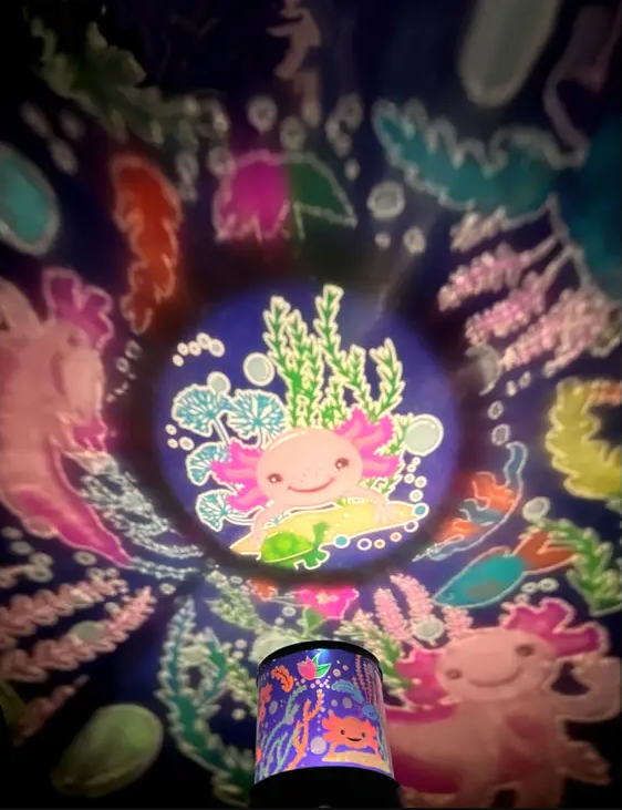 Project some friendly axolotls onto the ceiling of your room. Includes two light settings: white and color-changing. Requires 3 AA batteries (not included)