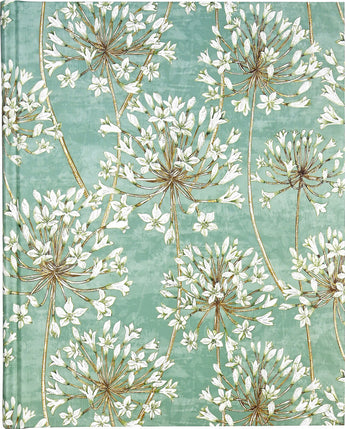 Elegant journal features a display of delicate white Allium Blossoms in full bloom, artfully arranged against a softly textured background.