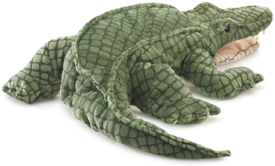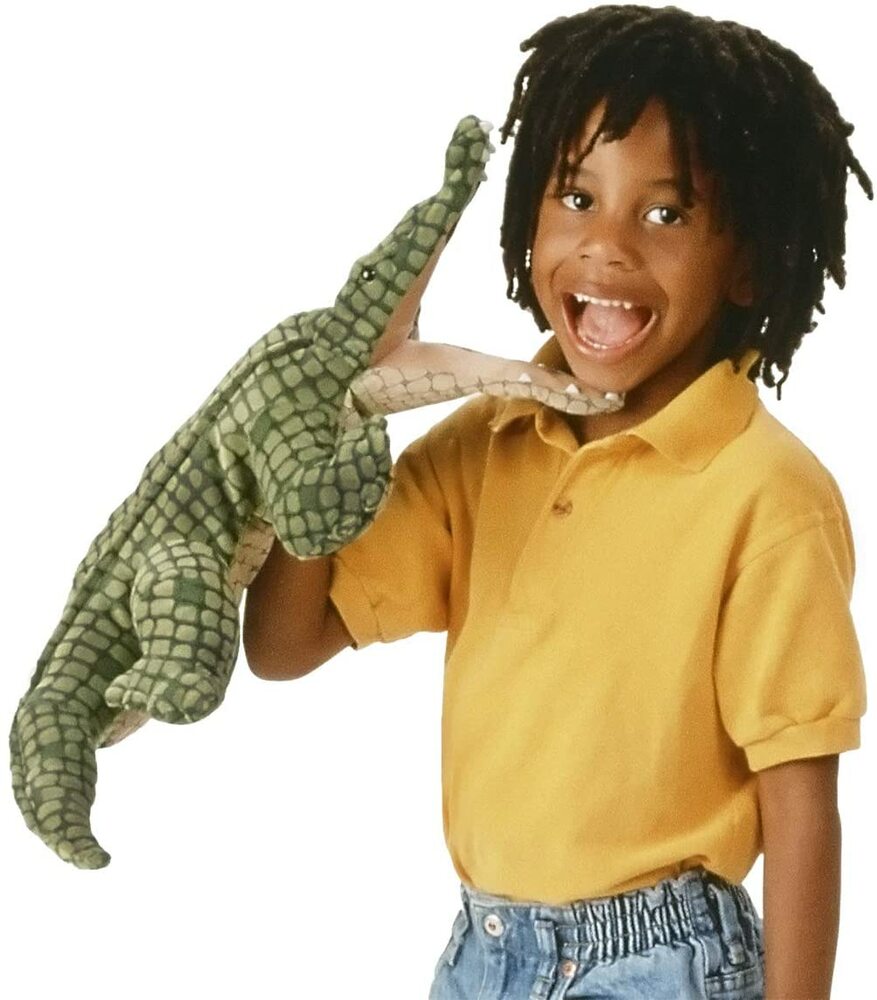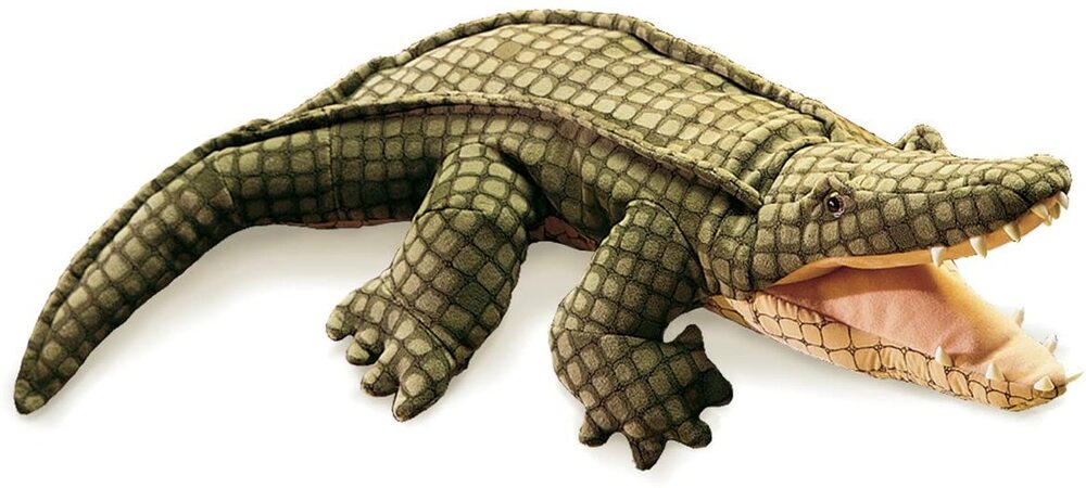 Our cuddly alligator will swamp you with affection! This realistically rendered puppet, with his silk-screened velour and velveteen body and soft plastic teeth, crouches at the riverbank ready to make a splash in your home!