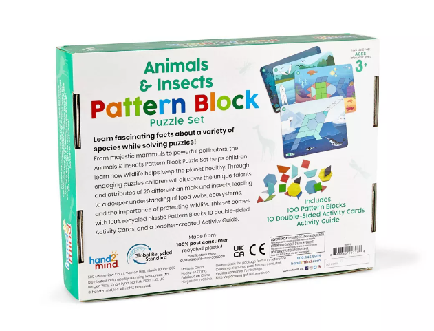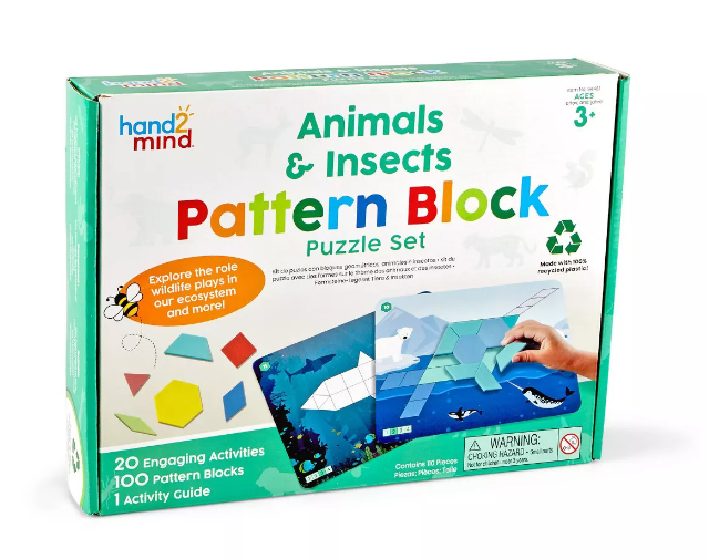 From magestic mammals to powerful pollinators, the Animals & Insects Pattern Block Puzzle set helps kids learn how wildlife helps keep the planet healthy. The set includes 20 different animal and insect puzzles, 100 recycled plastic pattern blocks and a teacher created activity guide. Through these puzzles, kids will learn about food webs, ecosystems and the importance of protecting wildlife!