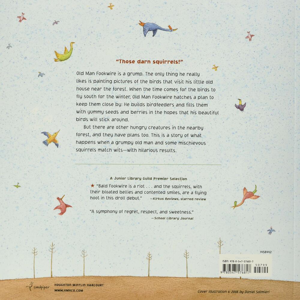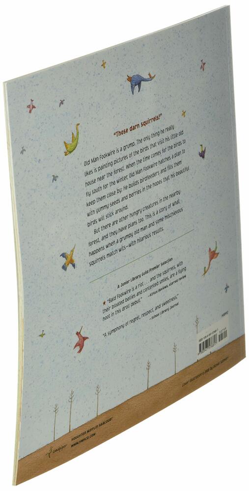 Old Man Fookwire is a grump, but painting pictures of birds in his backyard makes him happy! When they fly south every winter he feels sad and lonely. He tries to make them stay by filling his backyard with bird feeders full of seeds and berries, however the squirrels really like them instead! The squirrels come up with a plan to win over the old man.