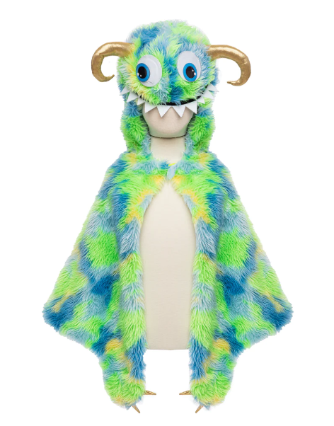 Immerse yourself in the world of mystical creatures with the captivating blend of vibrant blue and green hues, elegantly swirled in a mesmerizing tie-dye pattern. Each cape is hand-dyed, ensuring a unique and one-of-a-kind piece that stands out in any crowd. The vibrant colors exude energy and vitality, reflecting the vibrant spirit of those who dare to embrace their inner monster. This cape is made with long-pile fur & the addition of googly eyes and stuffed gold horns on the hood adds an extra element of fun and excitement.