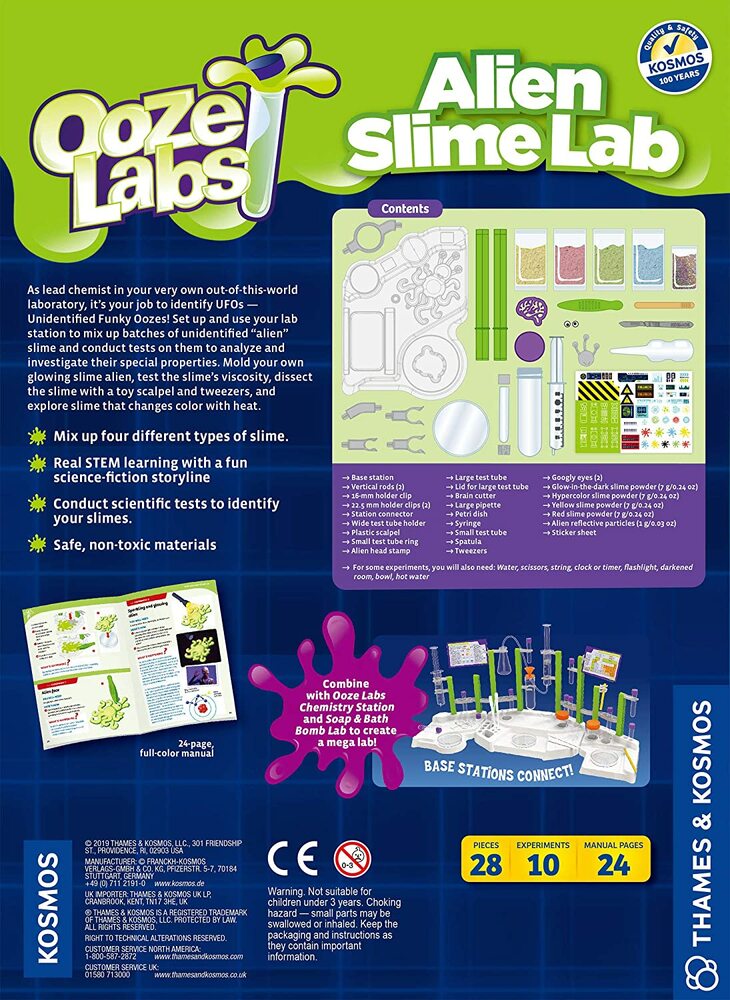 As lead chemist in your very own out-of-this-world laboratory, it's your job to identify UFOs - Unidentified Funky Oozes! Set up and use your lab station - separately or as an extension of the Ooze Labs Chemistry Station (a Parents' Choice Silver Honor winner!) - to mix up batches of unidentified "alien" slime and conduct tests on them to analyze and investigate their special properties.