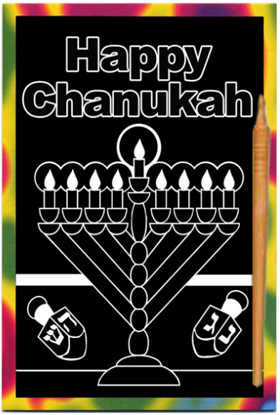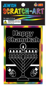 Scratch the black and white picture with the wooden stylus to reveal the colors below.  Add extra pictures and patterns to decorate the scene, or scratch one candle off each day as you count the 8 nights of Hanukkah.  Get creative!  Scratch board measures 6 X 4.5 inches.