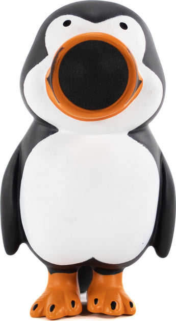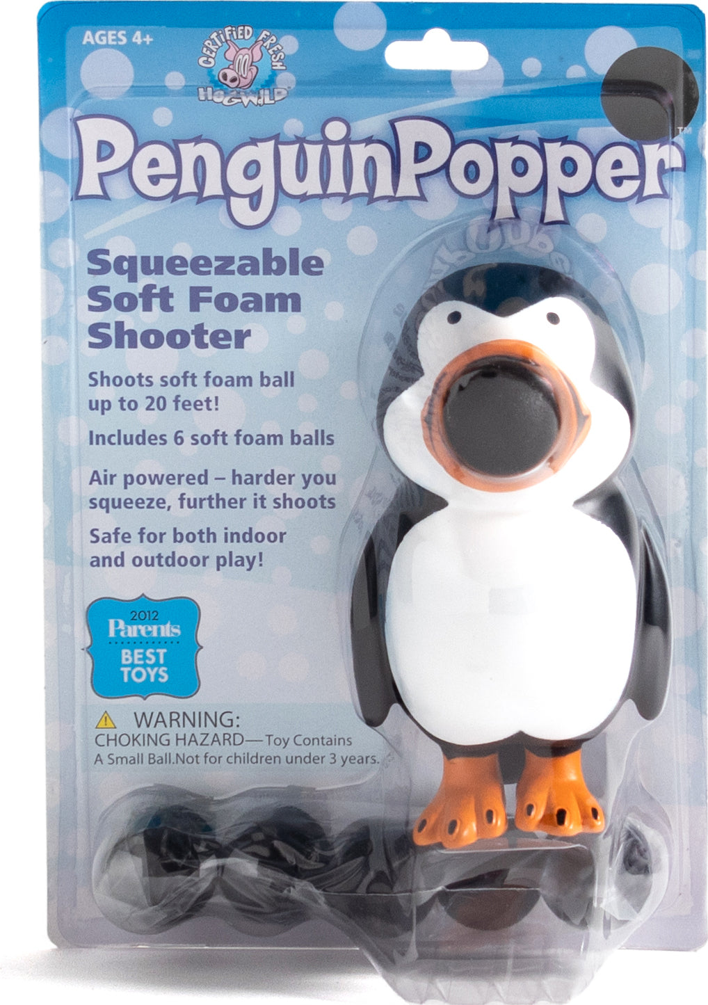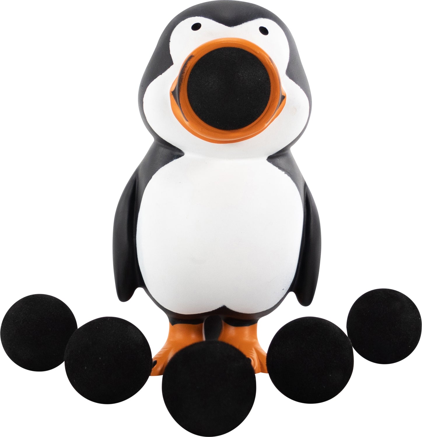 Squeeze the belly of this silly penguin and out pops a foam ball.  The balls are lightweight and unlikely to hurt anyone.  Comes with 6 balls.