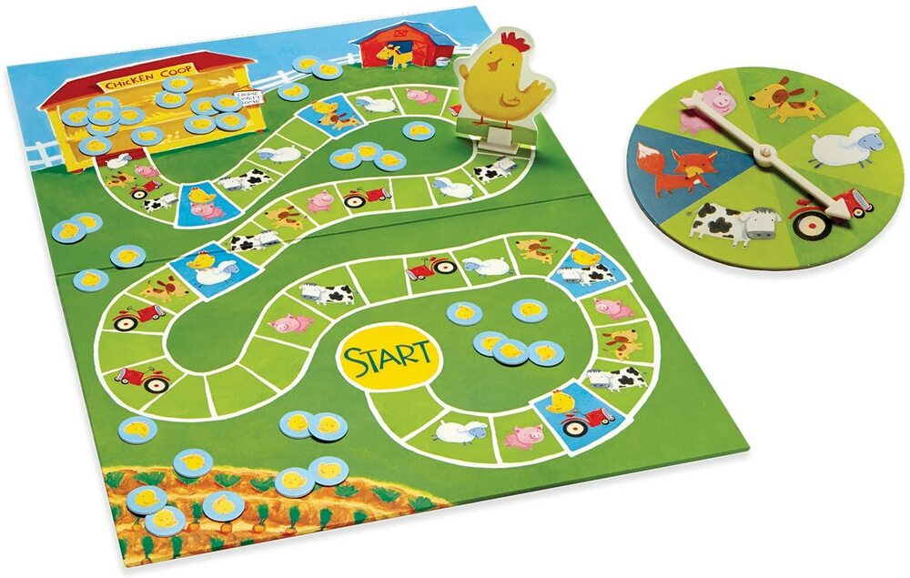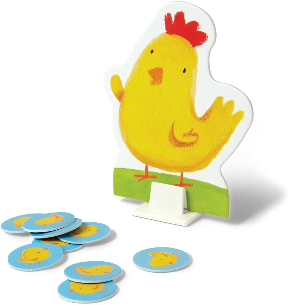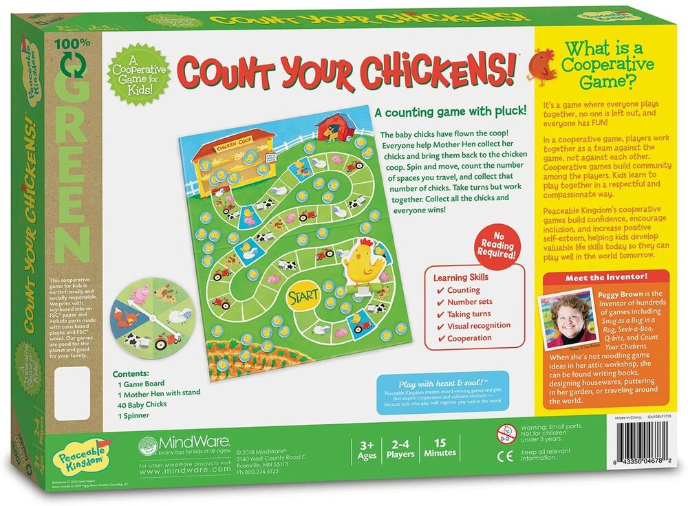 A cooperative game where players work together as a team against a common obstacle, not against each other. Count Your Chickens! Is a counting game with pluck. The baby chicks have flown the coop! Players help Mother Hen collect her chicks and bring them back to the coop. Spin and move, count the number of spaces, and collect that number of chicks. Take turns but work together. Collect all the chicks and everyone wins!