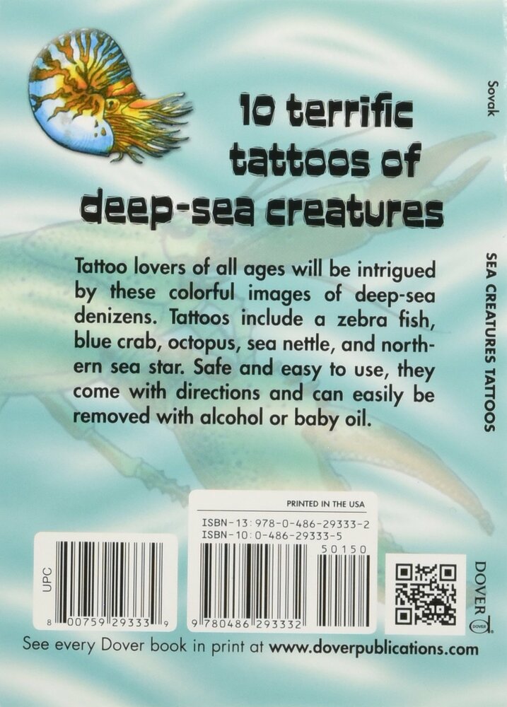 Tattoo lovers of all ages will be intrigued by these colorful images of deep-sea denizens. Tattoos include a zebra fish, blue crab, octopus, sea nettle, and northern sea star. Safe and easy to use, they come with directions and can easily be removed with alcohol or baby oil.