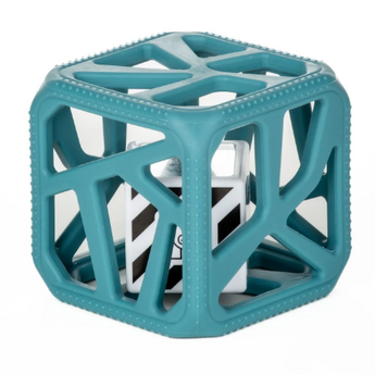 Chew Cube! A fun, and easy to grasp chew toy for your baby! A brightly colored silicone teether with a removable (only with adult help) contrast cube to add some entertainment to teething! For 3 months and up.